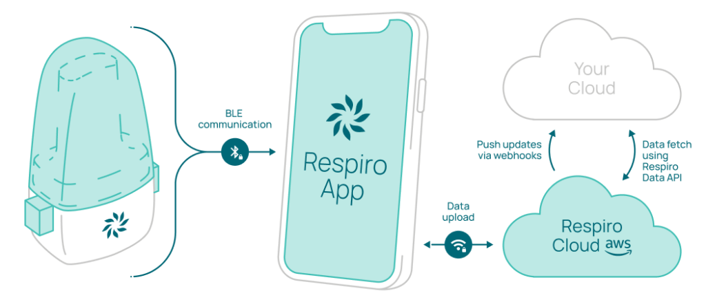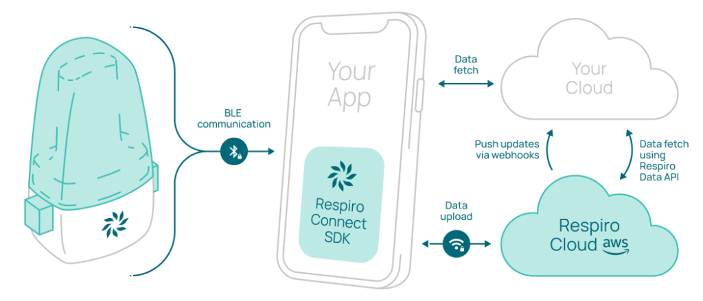 Embed Respiro with the Respiro Connect SDK (iOS/Android) and simple cloud hooks so device communication, data capture, and processing run in the background.